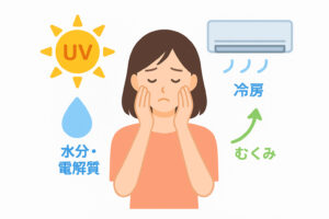 また、冷房の効いた室内と屋外の温度差で自律神経が乱れると、血流やリンパの流れが滞り、くすみや疲れ顔の原因に。鏡を見て「なんだか老けて見える」と感じる時、それはまさに“夏疲れ顔”のサインです。